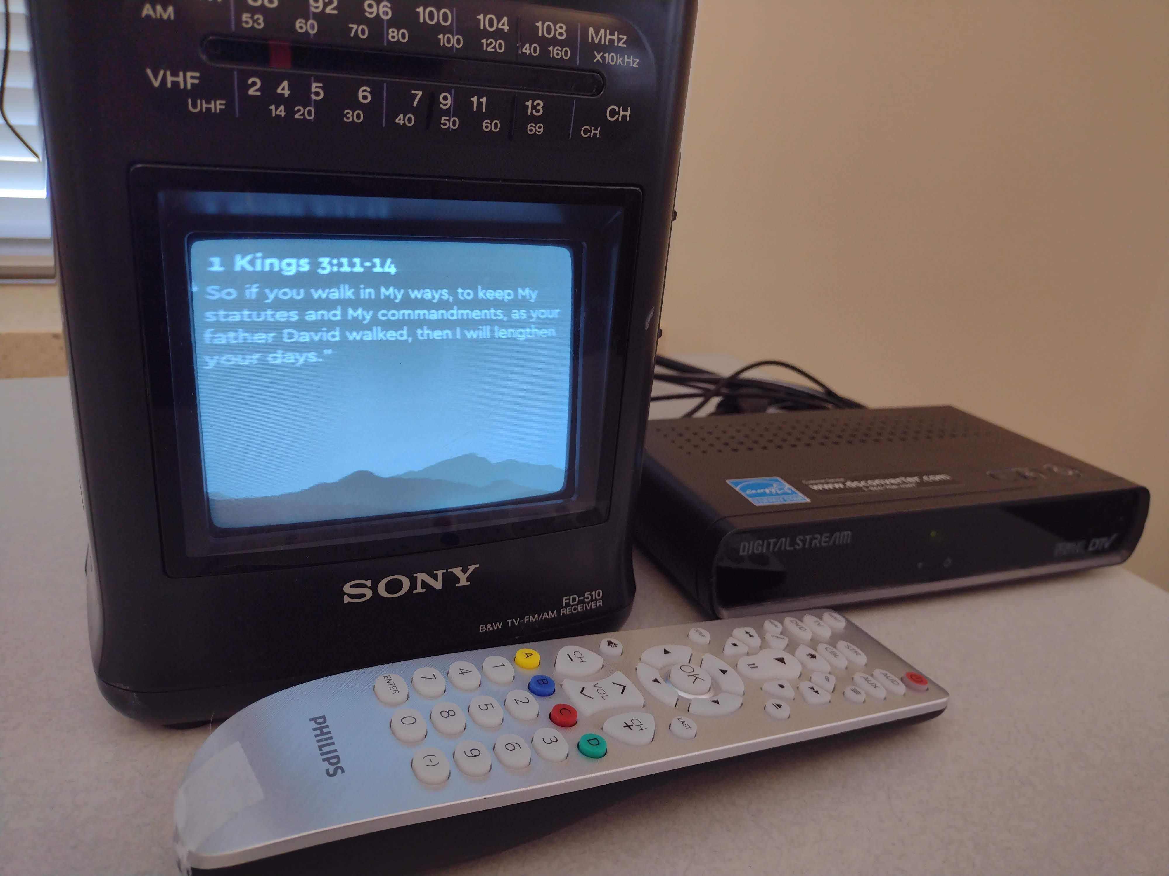 Because of the digital switchover in 2009 this required a digital converter box for the TV to pick up signals, and I found one at a thrift store for $3. I already had the universal remote. Got a cheap flat “antenna”, a coax cable, and eventually figured out I needed a doohickey that was both a female RG6 and a 3.5mm male (also cheap, thanks Copilot for figuring this out…) - the Sony FD-510 will accept an external antenna, but it must have a 3.5mm input, which is unusual.